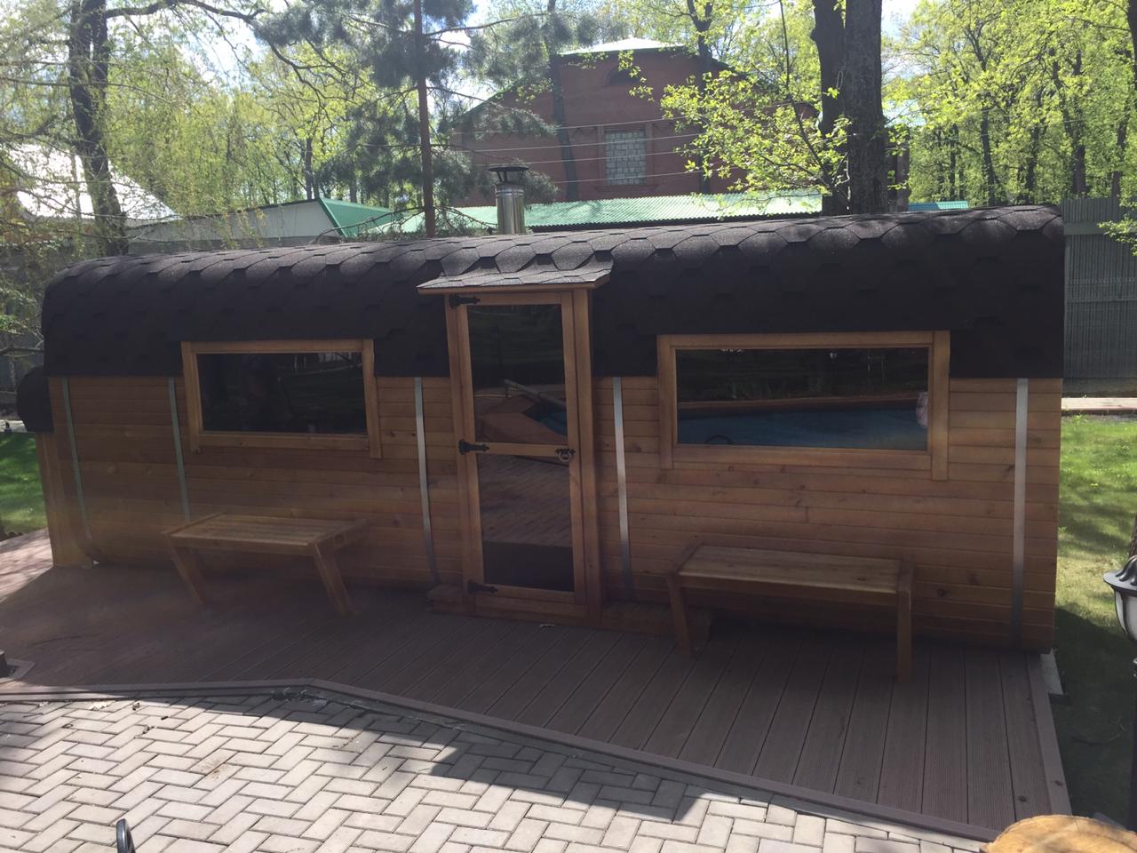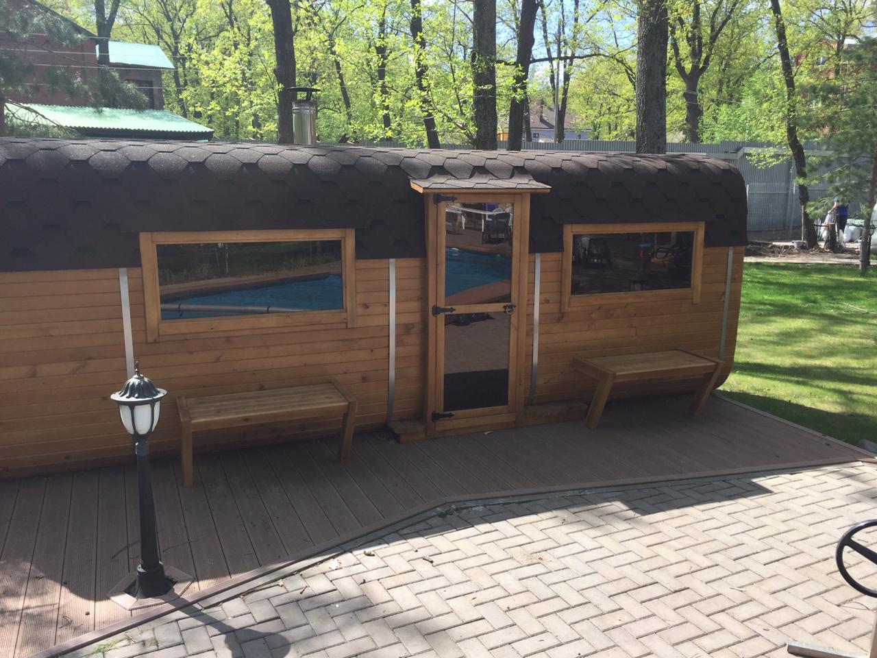 Шесть метров — это масштаб. Два больших отделения: просторнейшая парная и предбанник, в котором можно устроить полноценную зону отдыха. Для тех, кто не привык к компромиссам.